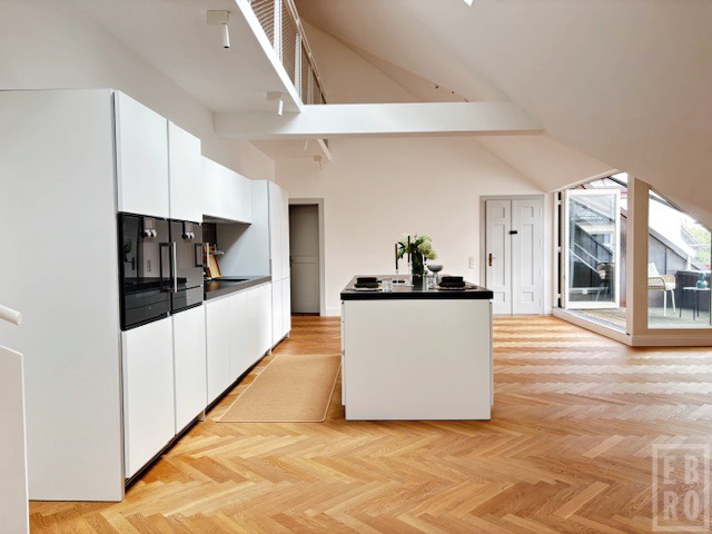 Herzstück ist der rund 57 m² große Wohn-/Essbereich mit direktem Zugang zur kleinen sonnigen Süd-Terrasse. Die moderne bulthaup-Küche mit zentralem Küchenblock erfüllt hohe Ansprüche an Design und Funktionalität. Schreinergefertigte Einbauschränke in den Schlafräumen sowie geschmackvolle, elegante Bäder von MATERIAL & KONZEPT unterstreichen den hochwertigen Charakter der Wohnung.