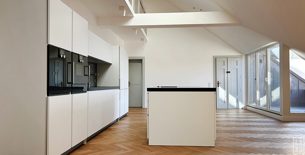 Herzstück ist der rund 57 m² große Wohn-/Essbereich mit direktem Zugang zur kleinen sonnigen Süd-Terrasse. Die moderne bulthaup-Küche mit zentralem Küchenblock erfüllt hohe Ansprüche an Design und Funktionalität. Schreinergefertigte Einbauschränke in den Schlafräumen sowie geschmackvolle, elegante Bäder von MATERIAL & KONZEPT unterstreichen den hochwertigen Charakter der Wohnung.