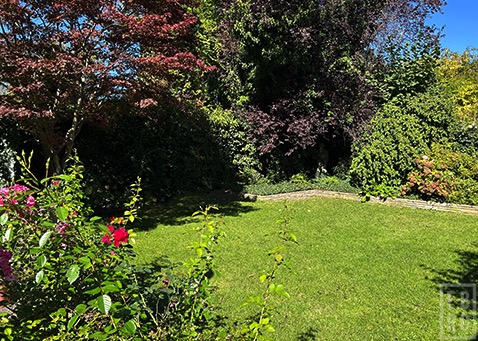 Auch das gemütliche Wohnzimmer mit Kamin und geschmackvollen Bibliothekseinbauten öffnet sich durch die kluge Grundrissgestaltung zum uneinsehbaren Garten.